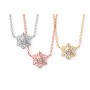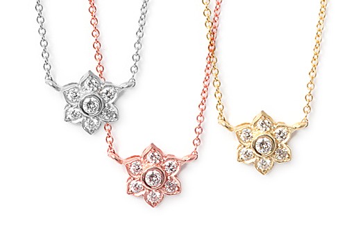 14k yellow, white, rose gold flower necklace with pave and bezel set diamonds of fine quality. Available with 16", 18", & 20" inch length chains.