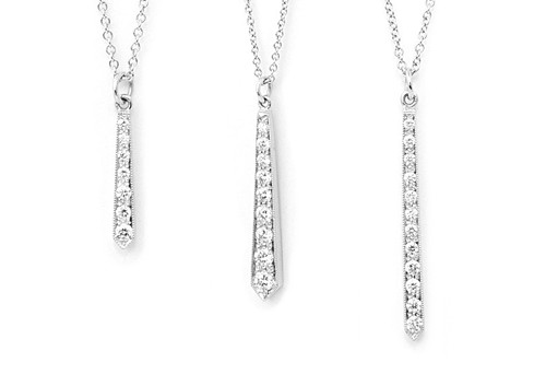 14k small, medium, large white gold diamond stick with pave set diamonds of fine quality. Available with 16", 18" & 20" inch chains.
