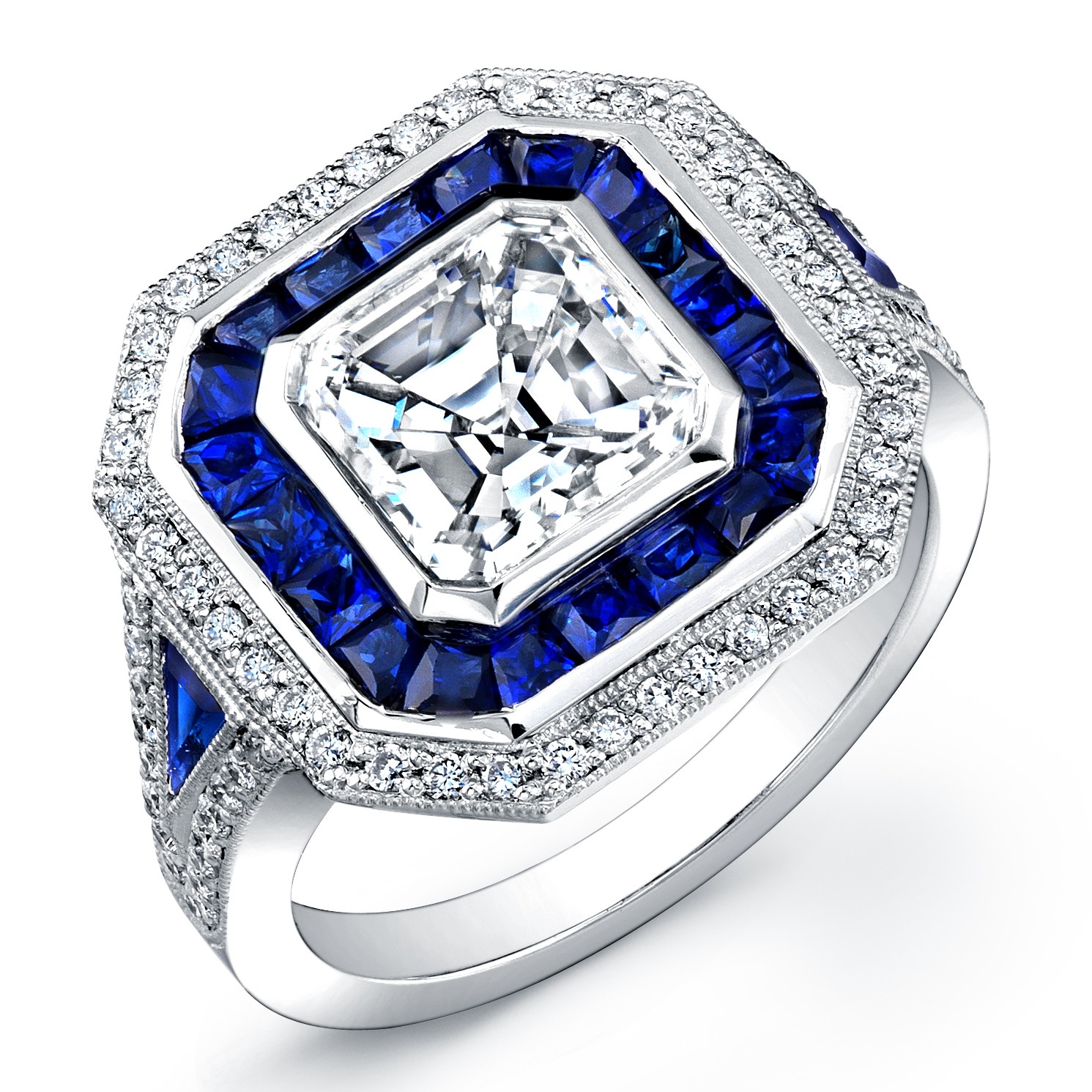 Platinum diamond and sapphire custom made ring with 74 round diamonds 0.32cts , 20 prince cut sapphires 0.90cts, 2 triangle cut sapphires 0.12cts, 2ct ascher cut diamond in center.