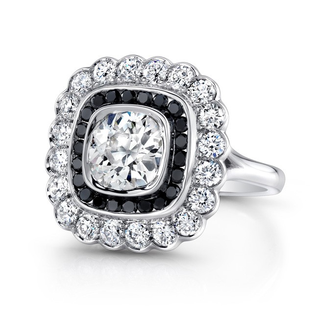 Ladies platinum handmade Art Deco Style Diamond Ring with 1.47 carats of white diamonds and 0.43carats of black diamonds.